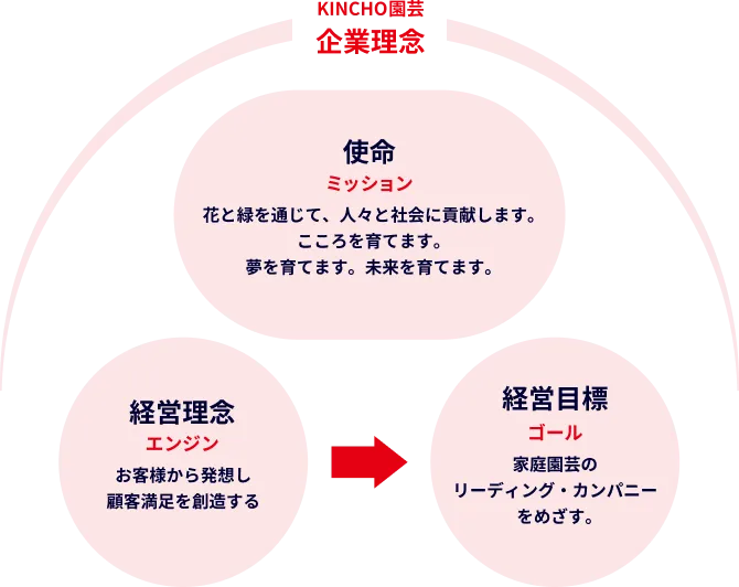 KINCHO園芸は、花と緑に関連する資材の研究・開発や普及を通じて、植物を愛おしむ心や思いやりと、社会にゆとりやうるおいを育み、健やかで豊かな「あしたを育てる」お手伝いをしています。