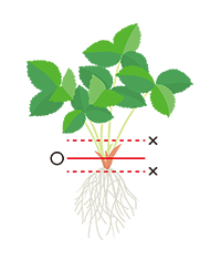 イチゴの葉のつけ根には、ギザギザの部分があります。これをクラウンといいます。このクラウンがほんの少し隠れる程度に浅植えにするのがコツです。