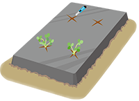 植えつけの2週間前に、1m²当たり100~150gの苦土石灰を散布してよく耕します。1週間前、1m²当たり堆肥2kgと粒状肥料「マイガーデンベジフル」を1m²当たり150~200gを散布し、さらによく耕します。幅60cm、高さ10cmの平畝をつくり、株間30cm、条間30cmの2条植えにします。葉のつけ根のクラウンが、少し隠れる程度に浅植えにし、たっぷりと水やりをします。