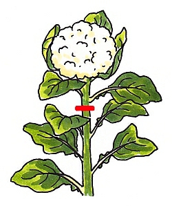 白色種のカリフラワーの場合、花蕾に直射日光が当たると黄化して、品質が悪くなります。花蕾の直径が6~7cmほどに成長したときに、外葉で花蕾を包んで遮光することにより、より美しい白色の花蕾が収穫できます。