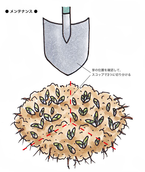 庭で植えたままにできる丈夫な多年草ですが、年月を重ねると株が大きくなり過ぎたり、芽が小さくなって花が咲きにくくなることがあります。鉢植えでは2年に1回、庭植えでは4年に1回を目安に、堀り上げて株分けを行いましょう。適期は春、あるいは秋です。芽の位置を確認して、剣型スコップやハサミなどで切り分けます。