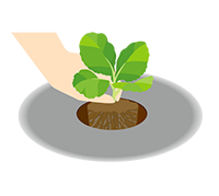アブラナ科の代表的な連作障害、根こぶ病にかかると収穫が期待できません。植え場所は、2~3年アブラナ科野菜を栽培していない場所を選びましょう。土づくりは、植えつけの2週間前に、1m²当たり100gの苦土石灰を散布し、よく耕しておきます。1週間前、1m²当たり堆肥2kgと粒状肥料「マイガーデンベジフル」を1m²当たり200gを散布し、よく土に混ぜ込みます。幅60cm、高さ10cmの畝をつくり、株間40~45cmをあけて植え穴を掘って、水をたっぷり注ぎます。水が引いたら苗を植えつけ、株元をしっかり押さえておきます。