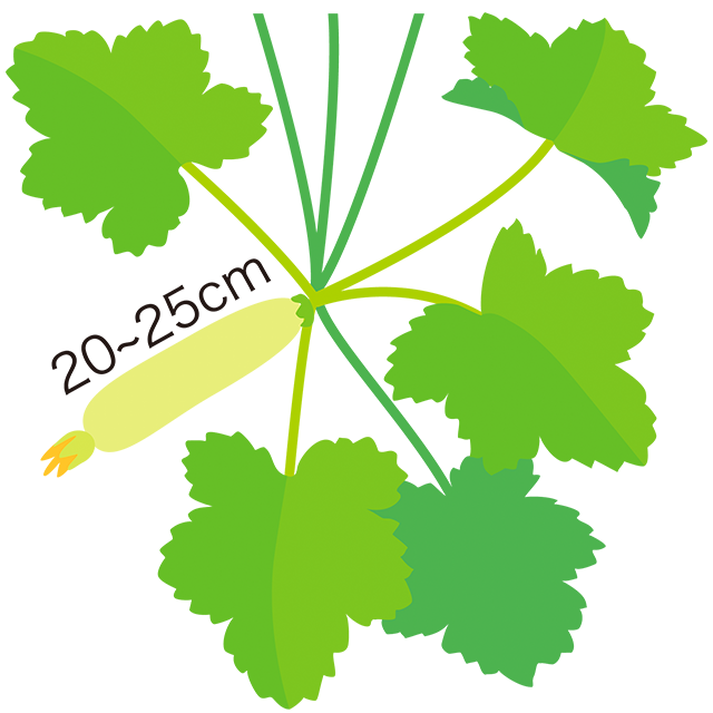 開花から4~10日後、長さ20~25cmの未熟な果実を若どりしましょう。収穫期間は約1~2カ月程度続きます。