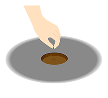 ダイコンは直根性のため、直まきにします。花芽分化が起きる気温の前に、根を十分肥大させることが必要なので、タネまき時期を守りましょう。春まきでは4月上旬~5月上旬、秋まきでは8月下旬~9月中旬が適期です。タネまきの2週間前までに、苦土石灰を1m²当たり100~150gをまいてよく耕しておきます。1週間前に、1m²当たり完熟牛ふん堆肥を2kg、粒状肥料「マイガーデンベジフル」120gをまき、土を砕くようにしてまんべんなく混ぜ、ふかふかで通気性のよい土をつくるようにします。1週間後、幅60cmの畝を立て、株間30cmをとって、底が平らな缶やビンを土の表面に押しつけて、深さ1cmほどのまき穴をあけます。まき穴1つにつき、4~5粒のタネをまき、覆土をしてたっぷりと水やりしましょう。