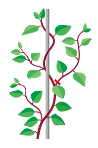 本葉が6枚ぐらい展開したときに摘心を行い、1株ごとに支柱を立てます。つるは丈夫なものに巻きついていくので、ネットよりも支柱を使います。支柱が不足すると、つるの上に別のつるが巻きついていくので、よく茂ってきたら支柱を追加するとよいでしょう。