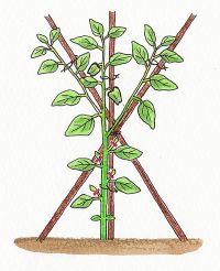 苗の植えつけは、遅霜の心配がなくなった5月上旬ごろが適期です。植え場所に、幅60cm(1列植え)か幅120cm(2列植え)の畝をたて、株間45~50cmとって、苗を植えつけます。植えつけ後、仮支柱を立て、茎を誘引しておきます。