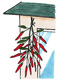 花後60日程度で、実がまっ赤に熟してきます。株ごと抜いて収穫し、軒下などに吊るして乾燥させる方法と、赤く熟した果実をポキポキ摘み取って収穫する方法があります。また、葉トウガラシの場合は、2~3番果が4~5cmに出そろったところで株ごと引き抜き、葉を摘み取って佃煮などに利用します。