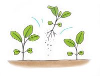 タネまきから20日後ぐらいに、本葉が3~4枚になったら、株間5~6cmになるように間引きます。
