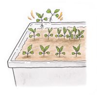 タネまき後7日目ぐらいに、双葉が開いて本葉が見えはじめたら、生育が悪いもの、病害虫のあるものを間引き、1カ所3本立ちにし、根元に軽く土を寄せます。さらに、本葉2~3枚で2本立ちにし、軽く土寄せします。間引き後には、500倍に薄めた液体肥料「マイガーデン液体肥料」か「花工場原液」か「ベジフル液肥」を、水代わりに与えます。その後も週に1回、同様に追肥します。本葉5~6枚のころに1本立ちにして、土寄せします。前回と同様の追肥を行い、草丈が15cmになったら、3回目の追肥・土寄せをし、生育を促進させます。肥料は、前回と同様です。