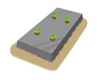 植えつけ2週間前に、1m²当たり100gの苦土石灰を畑および菜園に散布し、よく耕します。1週間前、1m²当たり堆肥2kgと粒状肥料「マイガーデンベジフル」を1m²当たり200gを散布し、丁寧に耕しておきます。幅60cmの畝を立て、表面をよくならしてから、黒マルチをはり、株間25~30cmに根鉢がすっぽり入る植え穴を掘ります。苗を丁寧にポットから出して植えつけましょう。