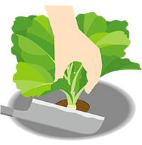 生育期間が短いので、元肥を施しているなら、追肥の必要はありません。元肥を施し忘れた場合は、植えつけから1週間後に、粒状肥料「マイガーデンベジフル」を1m²当たり200gを株元へばらまきます。