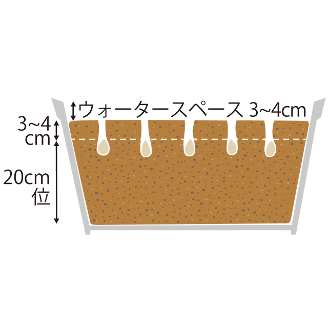 ①プランターの6分目ほどまで、適量の肥料を混ぜた用土を入れ、水をたっぷり注ぎます。次に、縁から3~4cm下の位置まで、適量の肥料を混ぜた用土を入れ、また水を注ぎます。