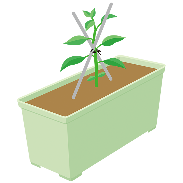 ④仮支柱をクロスさせて立て、茎を固定させます。プランターの底穴から流れ出てくるまでたっぷり水やりをします。