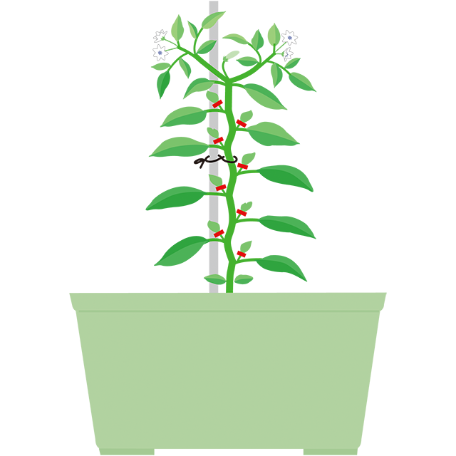 立てた支柱に、主枝を麻ひもなどで結び留める。1番花より下のわき芽は、すべて摘み取る。
