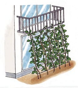 つるは4mぐらいにのびるので、家の2階やマンションの窓の日よけにするとよいでしょう。しっかりとしたつるが、堅牢なものに巻きついていくので、つるもの用ネットなどよりも、支柱を用いて誘引します。