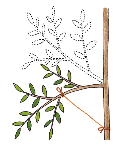 このような基本的な管理ができているのに花が咲かないということであれば、樹勢が強すぎるために花芽がつかないということが考えられます。上向きにのびた枝を下方向に誘引して樹勢を落ち着かせると、花芽がつきやすくなります(図参照)。