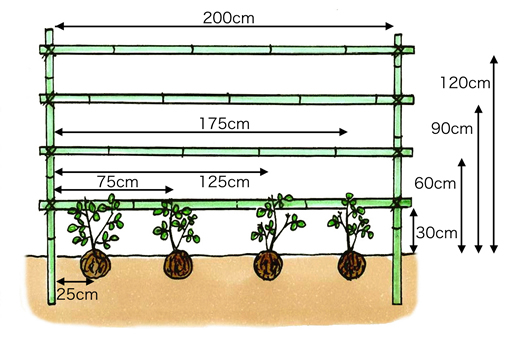 果実をつけさせるためには、別の株が必要なので、数本をまとめて植えます。