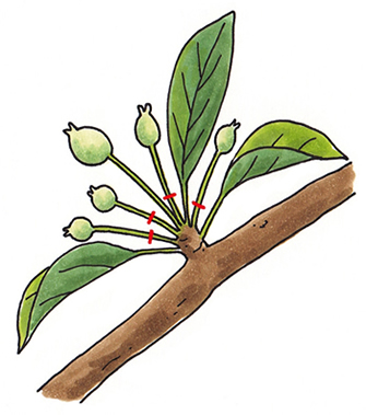 確実に着果させるためには、とくに昆虫の少ない市街地では、受粉樹の花を採取して、目的の品種の花に直接擦りつけるようにして人工授粉すると確実に着果できます。1本でも実がなる‘おさ二十世紀’のような品種は、庭にこの品種を1本植えるだけで収穫できます。‘おさ二十世紀’は開花期に枝を揺すると、さらに実つきがよくなるでしょう。