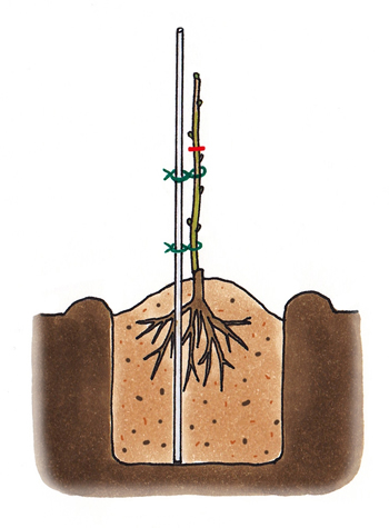 次に、ポリポットから取り出した苗を、肥料を加えていない残り2/3の混合土を用いて植えつけます。なお、水はけが悪い場所は、少し盛り土をするとよいでしょう。また、苗木は地面から50cmで切り、支柱を立て誘因ひもでしっかり固定します。