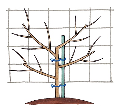 パッションフルーツはつる性植物のため、枝の誘引が必要です。果実を収穫する目的の場合は、あんどん仕立てが最適です。緑のカーテンに仕立てる場合は、ネットに誘引します(図参照)。主幹を一本立ちさせ、地表から20~30cmぐらいで左右に数本の主枝を分岐させて誘引し、さらに、それぞれの主枝から出る側枝をネットに誘引していきます。最初は頻繁に誘引が必要ですが、徐々に自分で巻きづるを伸ばし這い上がっていきます。側枝に花が多くつくので、収穫が終わるまでなるべく剪定はしないようにしましょう。