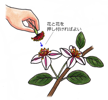 フェイジョアの栽培で注意するべきことは、「人工授粉」を行ない、結実を促す必要があるということです。‘アンドレ’や‘クーリッジ’のように自家結実性の品種もいくつかありますが、‘トライアンフ’や‘マンモス’をはじめ、ほとんどの品種は自分の花粉では実を結ばない自家不和合性の植物です。花のみを観賞する場合は1株でかまいませんが、果実まで収穫する場合は、必ず別品種を組み合わせて、2株以上で栽培することが必要です。