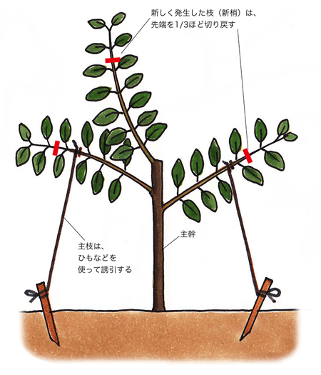 - 枝が伸長を始めたら、支柱を立てて、左右に枝を開きながら、混み合う枝や長く伸びる枝を剪定しましょう。