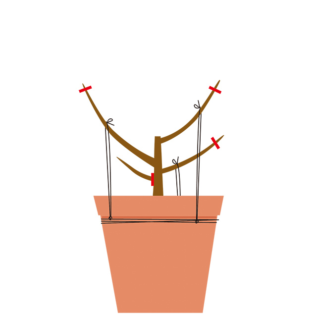 植えつけ2~3年目の冬:発生した枝のうち、充実した2~3本を主枝として選び、鉢の縁にひもを巻き、そのひもに別のひもをかけて枝を斜めに方向に引っ張り、左右に広げてバランスよく仕立てます。実つきがよい短い枝を多く発生させるのがポイントです。