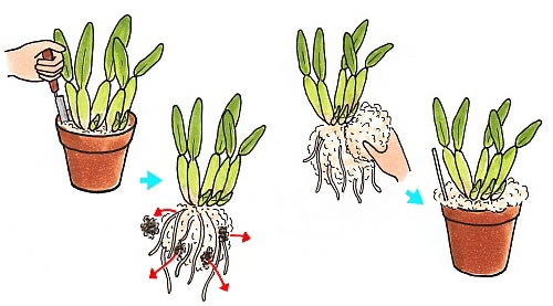 花が付いていたバルブの基部が鉢に接している場合は、植え替えが必要です。植え替えの基本は、根が動き出す直前に行うことです。