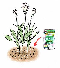 クルクマの球根は、春に販売されます。植えつけの時期は、ヤエザクラが咲き終わった頃。寒い時期に植えつけると、球根が凍って腐ったり、休眠してしまったりします。水はけと保水力のバランスのよい土を好みます。庭植えでは庭土に、鉢植えにする場合は培養土に、適量の粒状肥料「マイガーデン粒状肥料」、「マイガーデン花・野菜用」、「マイガーデン植物全般用」を混ぜ込んでから、球根を植えつけます。