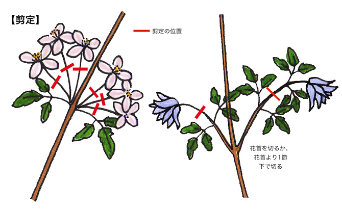 | 花がら切り | 傷んだ花、終わった花があれば、早めに花首から切り取って、タネができないように注意します。 |