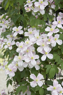 中国に自生する野生種、モンタナ種の選抜種といわれる。淡いピンク色の4弁の花を、つるの節々に数輪ずつ咲かせていく。花つきがよく、時として花で株が覆われてしまうほど。甘い香りも魅力の一つ。