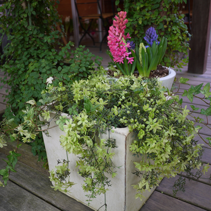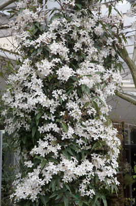 丈夫で育てやすいので、鉢だけではなく、庭でもモンタナ‘ルーベンス’のたっぷりの花を楽しみたい。
