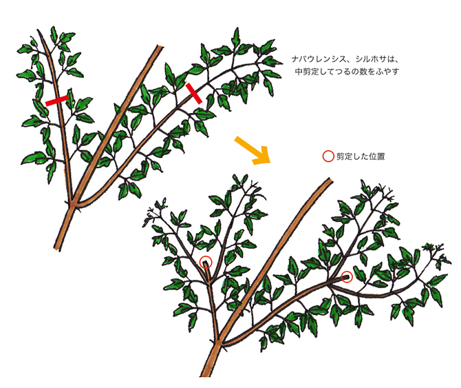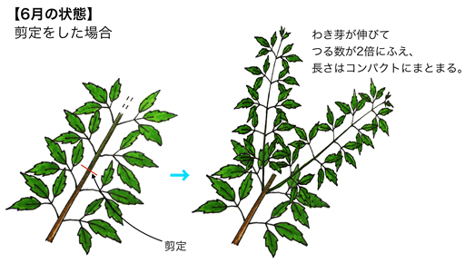 わき芽が伸びてつる数が2倍にふえ、長さはコンパクトにまとまる。 |