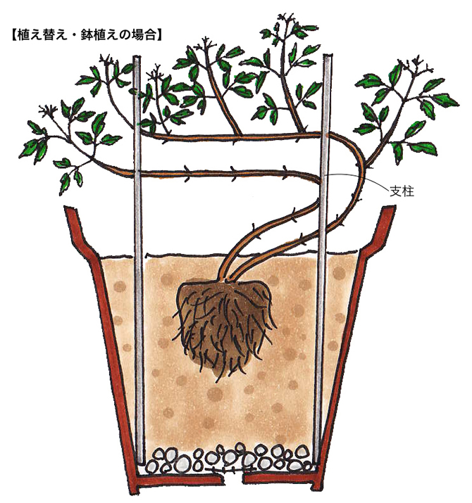 旧枝咲きのクレマチスは冬の間に植え替えることも可能ですが、購入した鉢仕立ての株は、根詰まり気味であるものが多く見られます。花後の剪定と同時期に、根鉢より1〜2回りほど大きな鉢に植え替えましょう。「12〜2月の植えつけ時」と同様に、株元から1〜2節が埋まるように深植えにするのがコツです。
