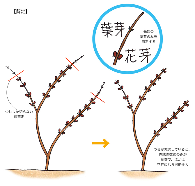 幼苗の場合は、丸い芽がついていないことがあるので、つるの長さの1/2程度まで切り戻します。新芽が出る位置が低くなるよう心がけると、バランスのよい株姿に成長します。