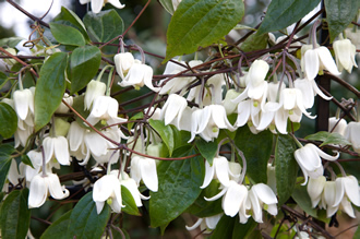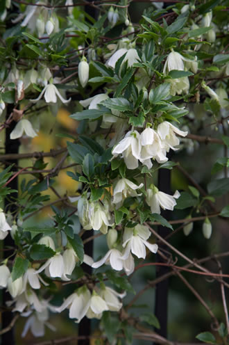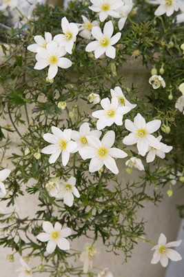 ニュージーランドに自生する原種。小さな緑色の星を散りばめたような花が咲く。花芯の黄色とのコントラストも見ばえする。クレマチスらしからぬ芳香がある。つるは伸びにくく絡まらないので、リング支柱などでサポートをするほか、ハンギングバスケットや壁掛けポットに仕立てることもできる。