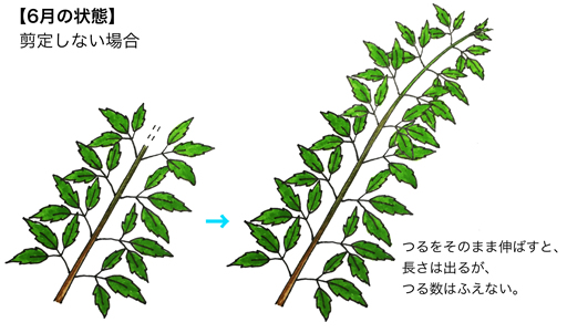 つるをそのまま伸ばすと、長さは出るが、つる数はふえない。