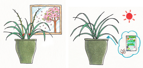 シンビジウムの花つきをよくするには、バルブを育てることが大切です。ポイントは花後の管理です。ソメイヨシノが咲き終わるころ、花後の花茎を株元から切り取ります。粒状肥料「マイガーデン粒状肥料」、「マイガーデン花・野菜用」、「マイガーデン植物全般用」を施し、日光にしっかり当ててバルブを育てましょう。すると、12月頃ごろから開花が始まります。