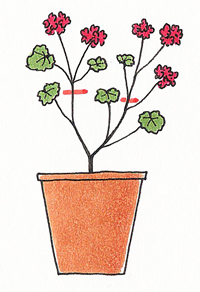 数年育てたゼラニウムは、草丈がかなり高くなります。株のバランスが損なわれるので、数年に1回ほど、高さ30cm程度の位置で切り戻します。適期は、晩秋や冬、真夏以外の時期です。切り戻した茎は、さし木に利用できます。