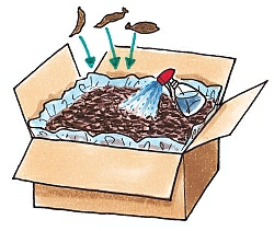 ダリアは、比較的寒さに弱い植物です。寒冷地で花壇植えにしている場合は、球根の掘り上げが必要です。気温が5℃以下になったら、球根を掘り上げましょう。掘り上げるときは、球根についた芽を折らないように優しく扱います。掘り上げた球根は、段ボール箱に通気口(穴)をあけたビニールを入れて、その中にピートモスをいっぱいに入れます。ピートモスは、あらかじめ霧吹きで水をかけ、軽く湿らせてから、球根を入れましょう。球根を入れた段ボール箱は、10℃前後の場所に保存します。温度が高すぎると芽が動き始めたり、球根が腐ることがあるので注意しましょう。月に1度、できる限り球根の状態を確認してください。ソメイヨシノが咲くころに、球根を取り出し、分球して花壇に植えます。分球するときは、必ず生長点のある茎部分をつけます。