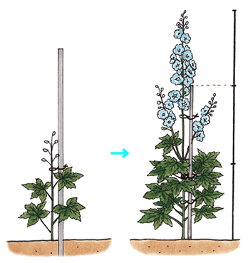 デルフィ二ウムの長い穂になる花は、下から順に咲き進み、1~2週間ほど楽しむことができます。花の重みや風で花茎が倒れやすいのですが、まっすぐに伸びた美しい姿を楽しむためには、春に株の中心から上がりはじめる花穂の長さがひざ丈ほどになったら、支柱を花茎の後ろに沿わせるように立てましょう。支柱は地中に20cmほどさし込みます。花穂の長さを想定して、立てる支柱は草丈の2/3を目安にします。花が咲いたら支柱の長さを調整し、また、花穂の伸び具合に応じて、随時ひもで8の字に結んで支柱に留めていきましょう。