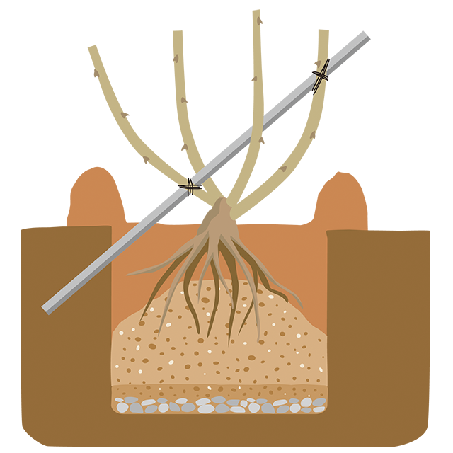 誘引は、枝が曲げやすく、誘引しやすい休眠中に行ないます。早めに誘引しておくと春の芽吹きがよく、蕾をたくさんつけやすくなります。