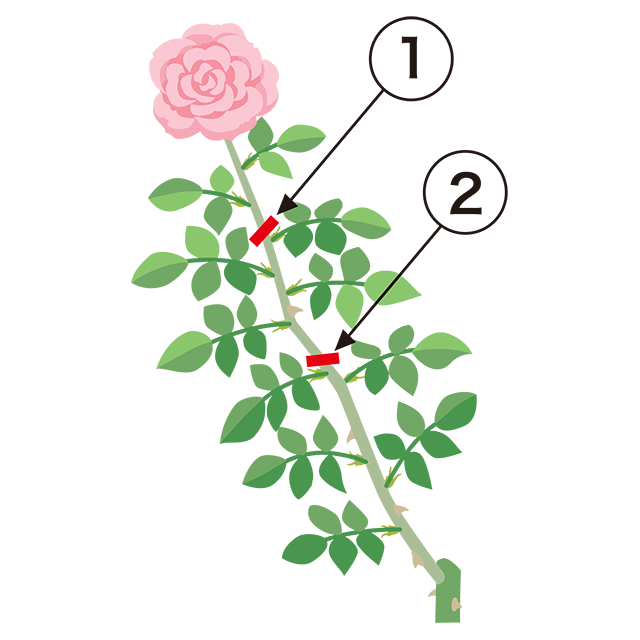 咲き終わったバラの花(花がら)は、その都度切り取ります。花がらを切ったあと、活力剤(活力剤「マイローズばらの活力剤」など)を与えておくとよいでしょう。 [よく咲く木立性の場合]切る位置は、おおむね伸びた枝の半分辺りです。なるべく外側を向いた大きな葉を4~5枚分残して切り戻します。大きな葉の上で切ると、葉が光を受ける面積が大きいため、光合成の量も多く、充実したよい芽が出やすくなります。