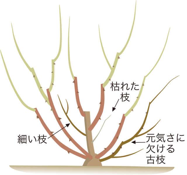 ①枯れ枝、傷んだ枝、細くて短い枝、元気がない古枝を切り除きます。