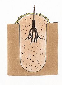 ボタンの苗は多くが接ぎ木苗で、台木には、同じボタン科ボタン属のシャクヤクの根が使われています。丈夫なシャクヤクの台木のお陰で、ボタンは飛躍的に栽培しやすくなり、広く普及したといえます。ただし、シャクヤクの根が強すぎて、やがて接がれたボタンのほうが枯死し、シャクヤクだけになることもよく見受けられます。まず、庭植えでは、深さ40~50cm程の穴を掘り、適量の粒状肥料「マイガーデン粒状肥料」、「マイガーデン花・野菜用」、「マイガーデン植物全般用」を、1m2当たり150gを混ぜて植えつけます。接ぎ木部分に厚さ10cm程度の土を被せるように植えつけましょう。こうすることで、ボタン自身の根が発生し、丈夫に育ちます。