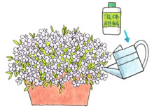 ロベリアは、たくさんの花をつけるので、肥料切れを起こしやすい植物です。しかし、根が細いため、間違った施肥をすると肥料焼けを起こすことがあります。液体肥料「マイガーデン液体肥料」、「花工場原液」の2,000倍液を、週に1回施しましょう。