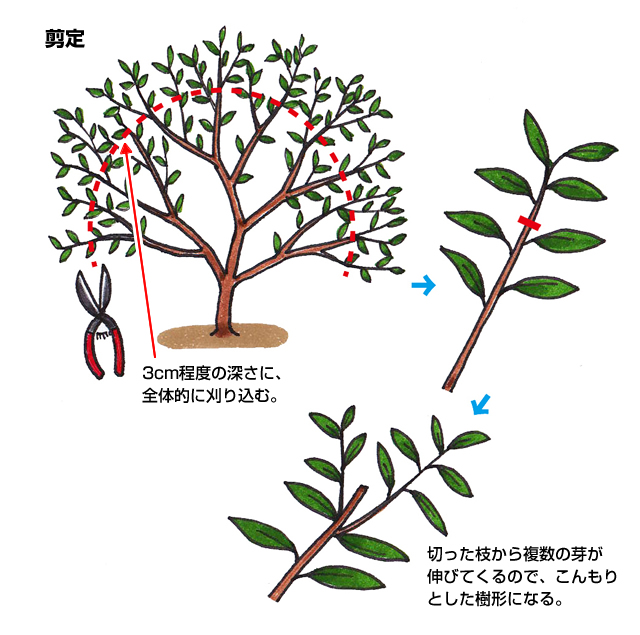 枝数も多く、芽吹きもよいので、伸び始めた枝も一緒に、好みの形に刈り込むことができます。しかし,あまり深く切ると新芽が出にくくなることがあるので、刈り込みは3cm程度の深さに止めます。また、この時に枯れ枝や重なった枝も基部から剪定し、風通しをよくします。