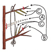 なお、枯れ枝(A)ができて垣根に穴が開いた時は、まず枯れ枝(A)を切除し、枯れ枝の上下の枝の内側の枝(B)を、先端からから1/3程度切り、枯れ枝側に伸びた新梢(C)のみを残して、2本の枝(B)を縄で縛って互いに引き寄せ、枝を成長させて穴を埋めます。