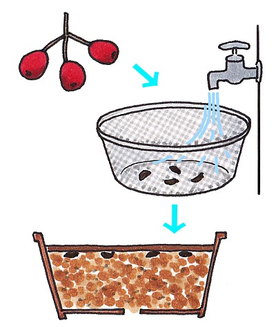 なお、タネは乾燥させると発芽能力がなくなるので、果肉を取り除いたらすぐに赤玉土の小粒などにまいて1cm程度覆土します。タネをまいた鉢や箱は屋外に置き、乾かさないように水やりして管理すれば、春に発芽します。ただし、1年で発芽しないタネもあるので、十分な数が発芽しない場合は、翌年まで管理してみましょう。