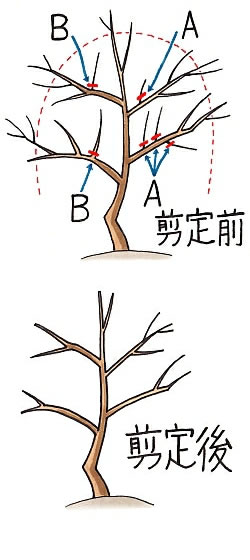 まず、樹の内側の枝や混みすぎた枝(A)や、上方向に勢いよく伸びる枝(B)は基部から切り除き、株の内側にも日が当たるようにすると、株全体に花を咲かせます。